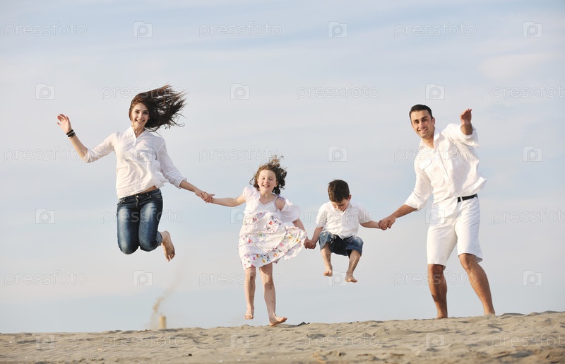Счастливая молодая семья на пляже