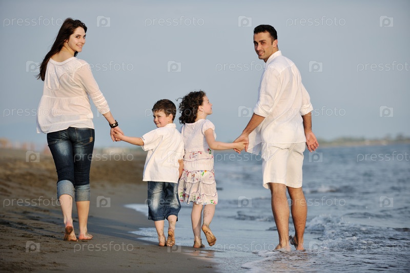 Счастливая молодая семья на пляже