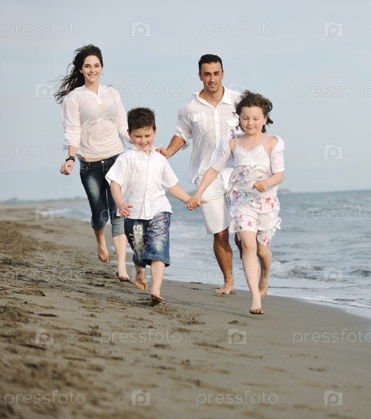 Счастливая молодая семья на пляже
