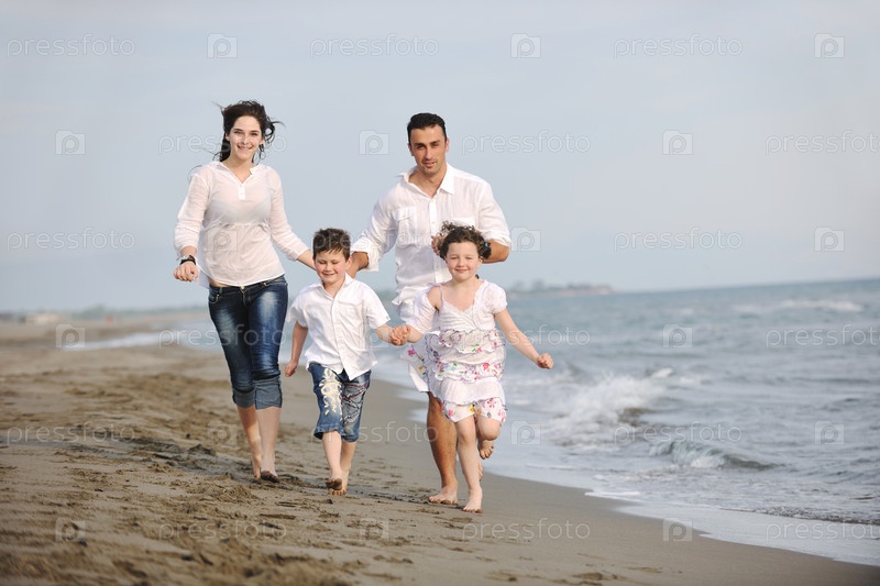 Счастливая молодая семья на пляже