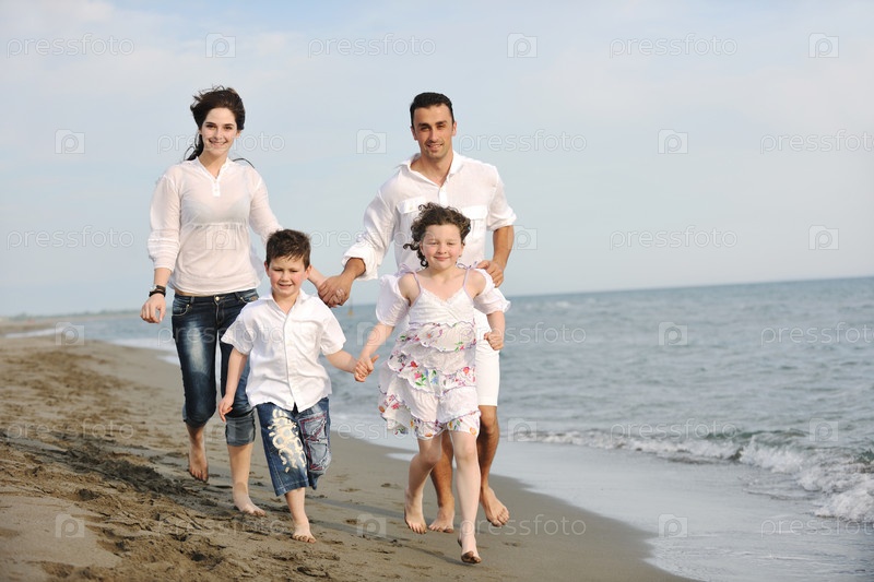 Счастливая молодая семья на пляже