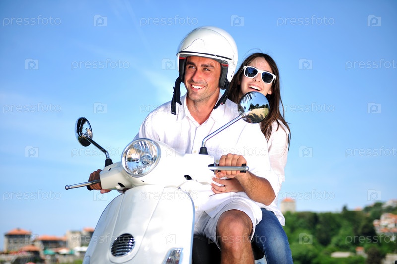 Счастливая молодая пара на скутере