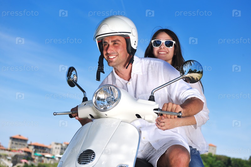 Счастливая молодая пара на скутере