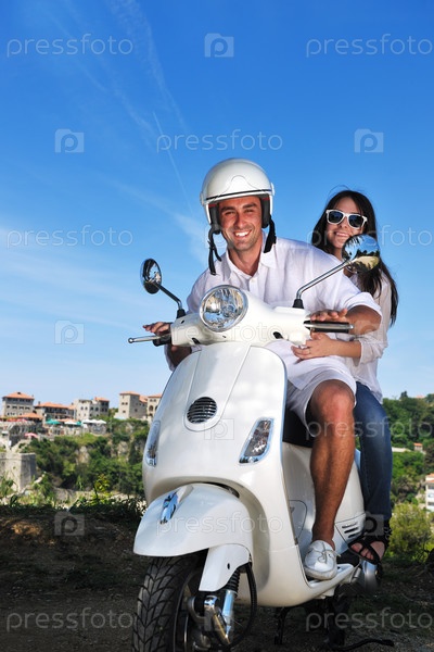 Счастливая молодая пара на скутере