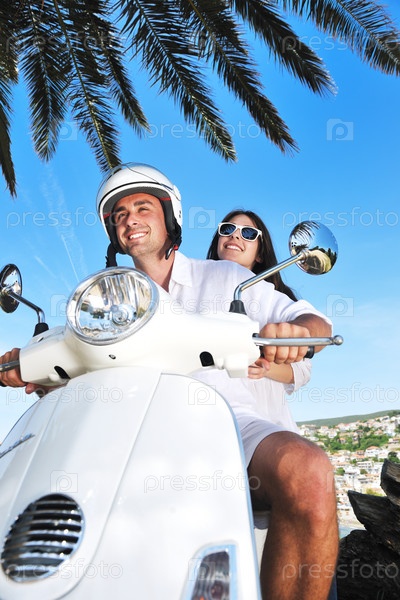 Счастливая молодая пара на скутере