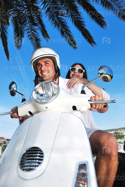 Счастливая молодая пара на скутере
