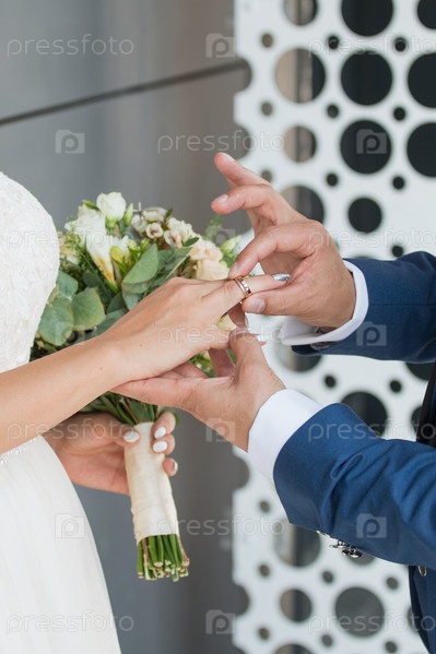 Жених надевает кольцо на руку невесты