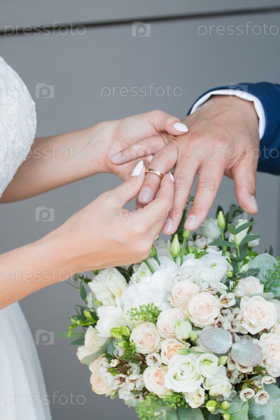 Невеста надевает кольцо на руку жениха