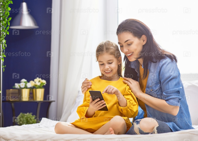 Мать и дочь играют на телефоне