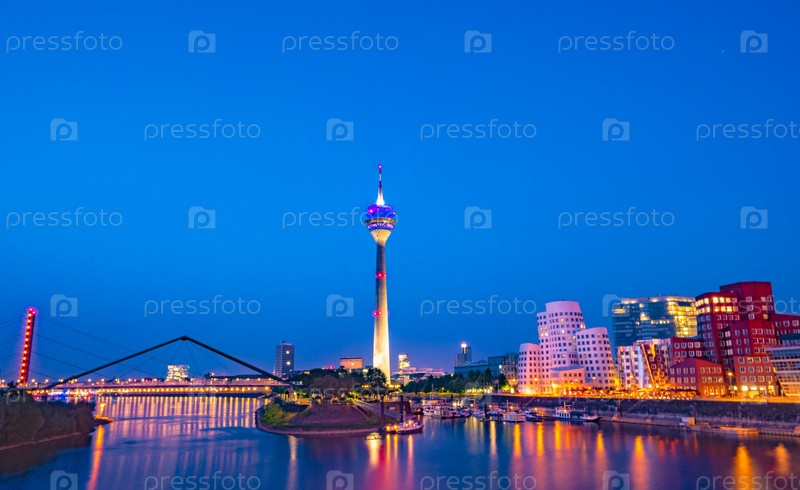 Красочная ночная сцена реки Рейн ночью в Дюссельдорфе