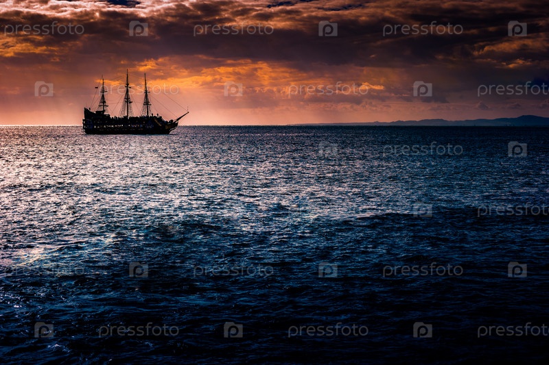 Одинокий корабль на фоне утреннего неба
