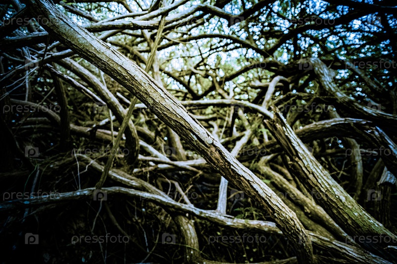Корни и ветви деревьев в глухом лесу