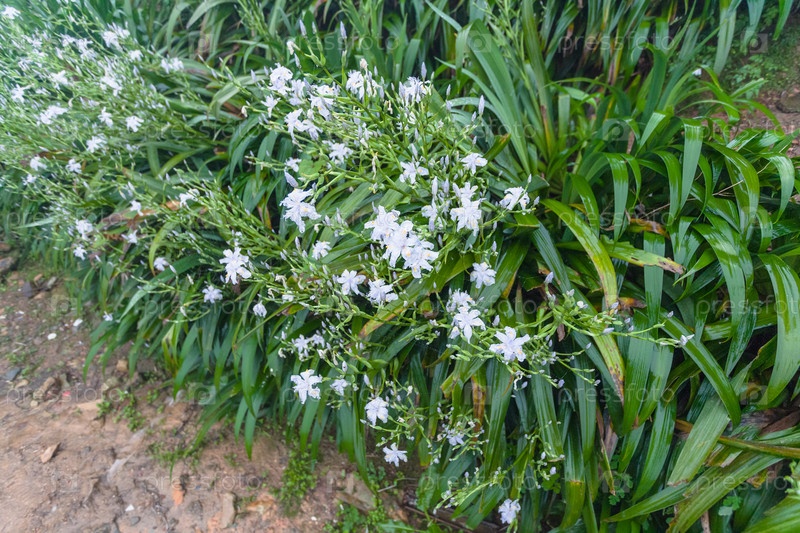Влажные зеленые кусты с белыми цветами лилии