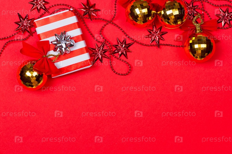 Красный фон с подарком и украшением