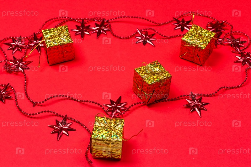 Красный фон с подарками и украшениями