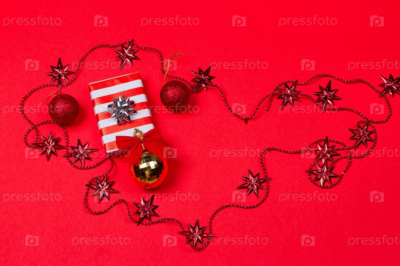 Красный фон с подарком и украшением