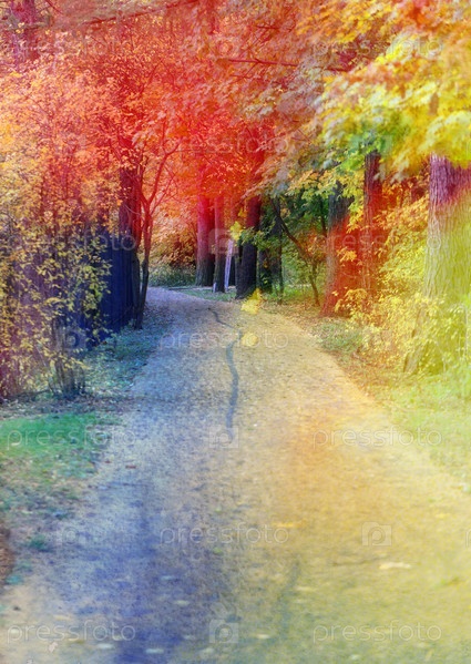 Акварельная разноцветная дорога в осеннем лесу