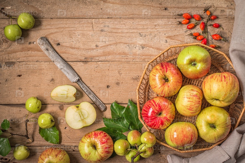 Корзина со свежими яблоками на старом деревянном столе