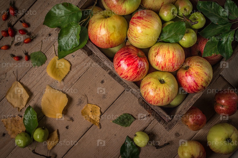 Ящик со свежими яблоками на старом деревянном столе