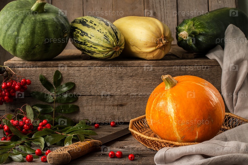 Желтая тыква на деревенском деревянном столе