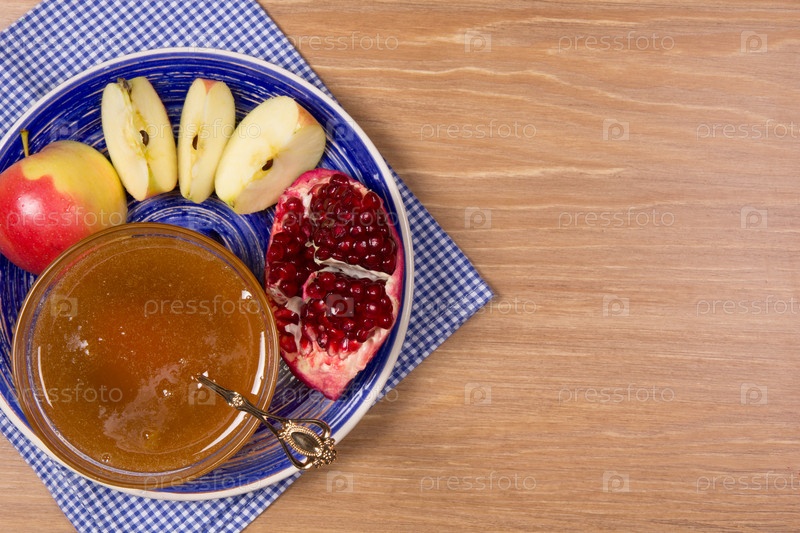 Спелый гранат, мед и яблоки