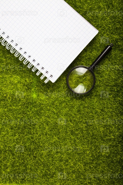 Блокнот и лупа на траве