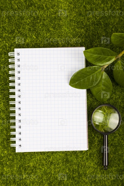 Блокнот, лупа и зеленые листья