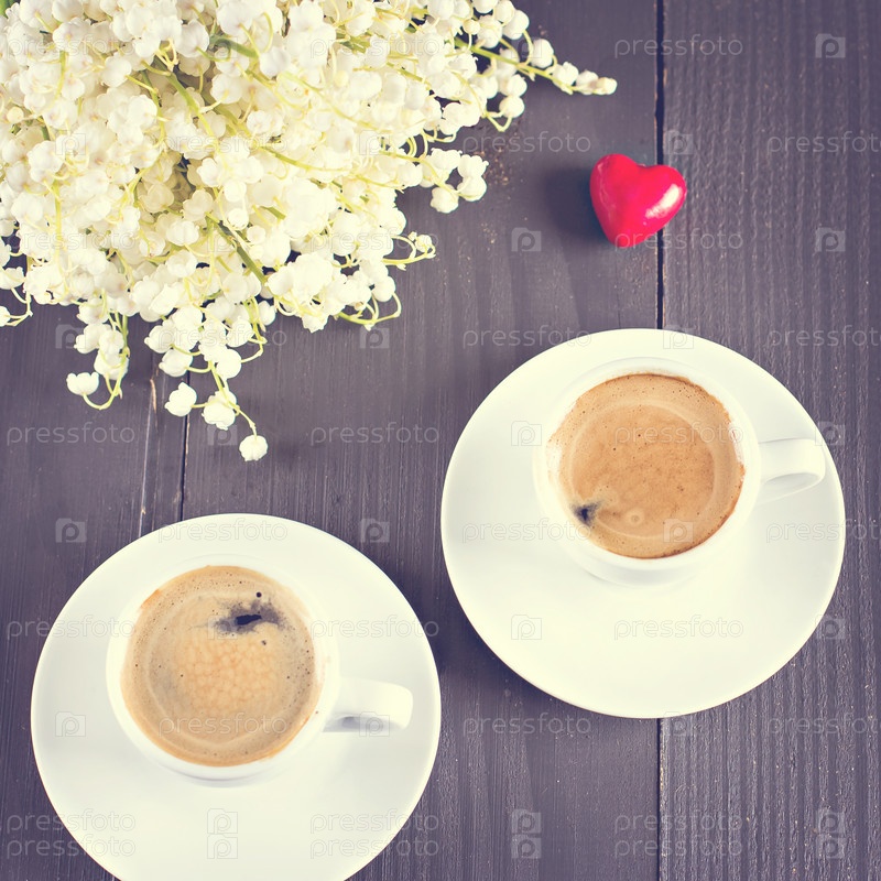 Две чашки кофе эспрессо и букет цветов