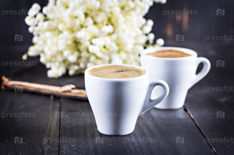Две чашки коф эспрессо и букет цветов