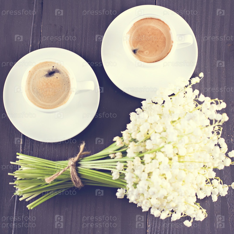 Две чашки коф эспрессо и букет цветов