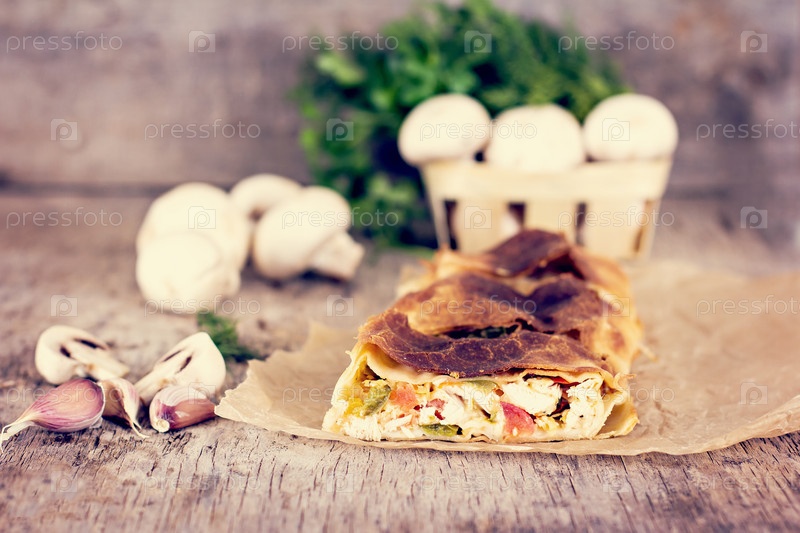Самодельный рулет с курицей, грибами, сыром и овощами