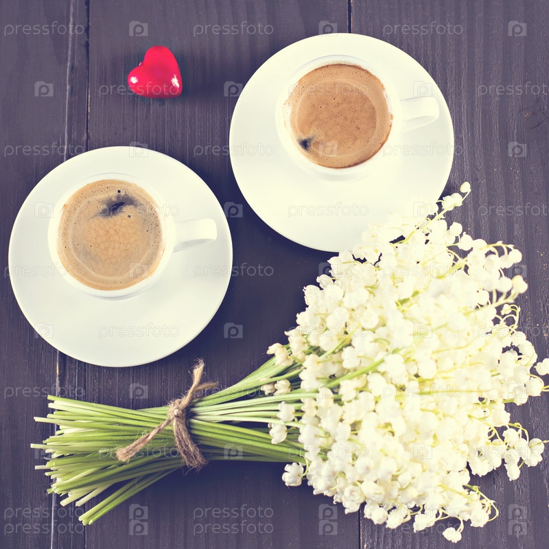 Две чашки кофе эспрессо, сердце и букет цветов