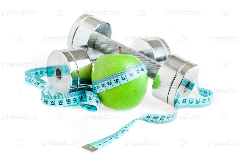 Гантели с яблоком и сантиметром на белом фоне. Здоровый образ жизни
