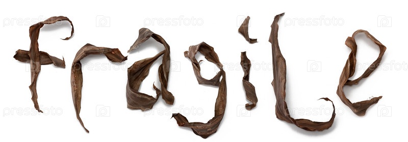 Сухие листья собраны в слово "хрупкий", изолированны на белом фоне