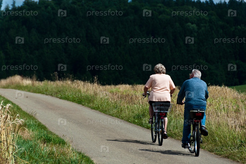 Пожилая пара на природе на велосипедах