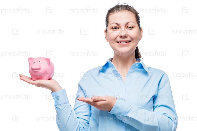 Молодой бизнесмен с копилкой на ладони на белом фоне