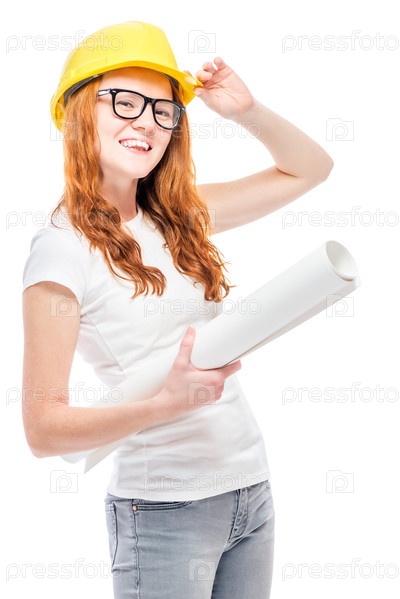 Молодая женщина с проектами в желтой каске