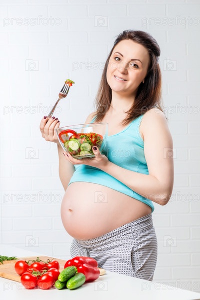 Портрет красивой беременной женщины с миской салата