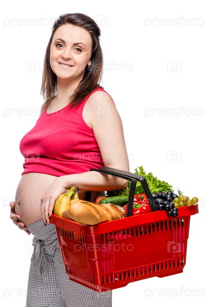 Молодая беременная женщина с корзиной фруктов и овощей