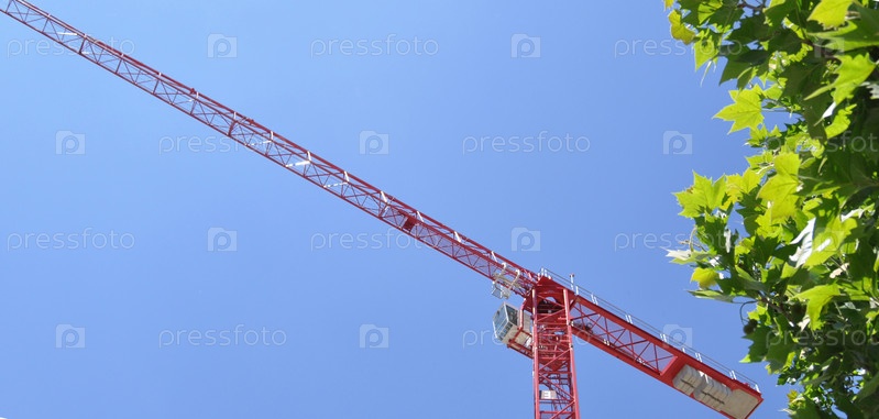 Красный строительный кран на фоне голубого неба