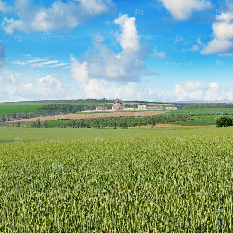 Поле и православный храм на фоне голубого неба