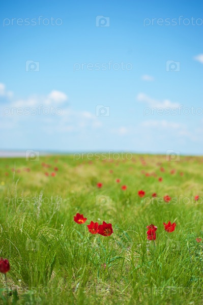 Луг с цветущими красными тюльпанами