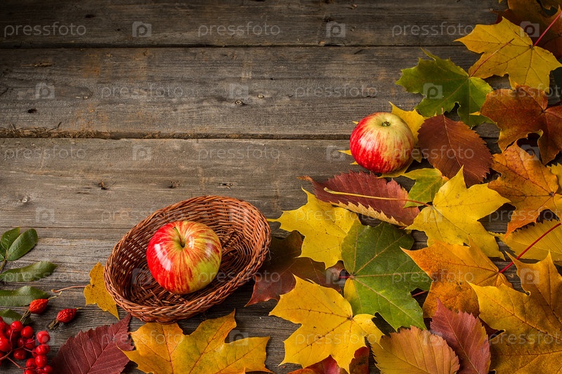 Красные яблоки на осенних листьях