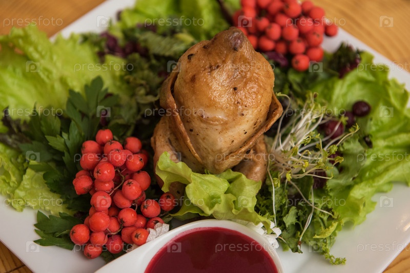 Перепел, жареный со сладко-кислым клюквенным соусом