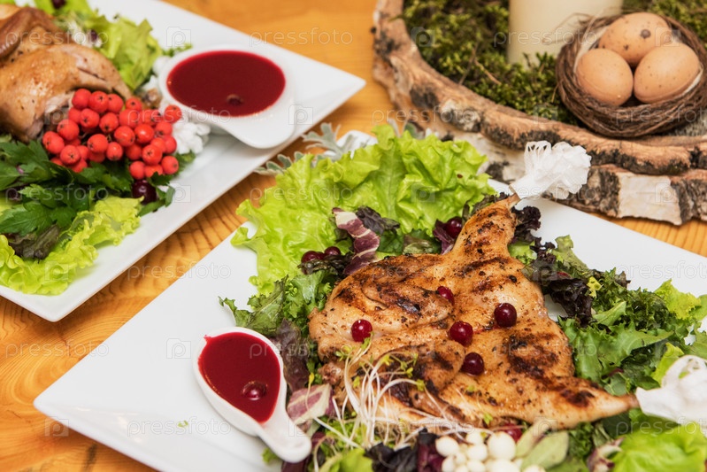 Перепела жареные со сладко-кислым клюквенным соусом