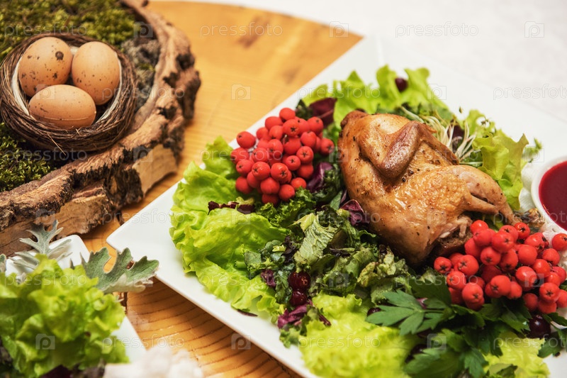 Перепела жареные со сладко-кислым клюквенным соусом