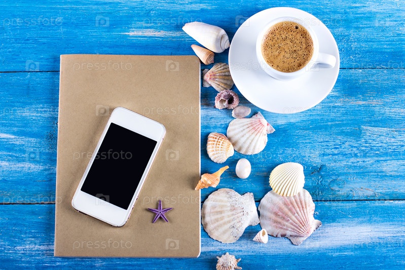 Чашка кофе, раковины и мобильный телефон