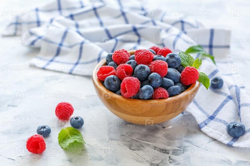 Свежая малина и черника в деревянной миске