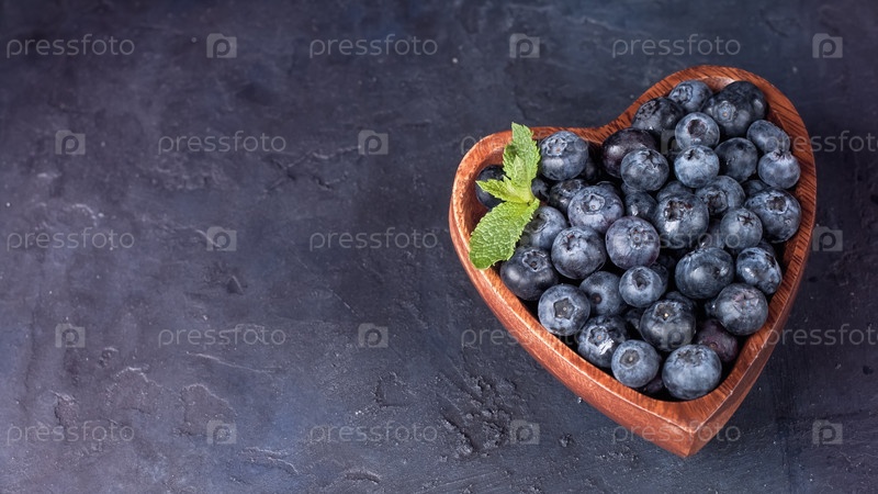 Свежие ягоды черники с мятой в миске в форме сердца
