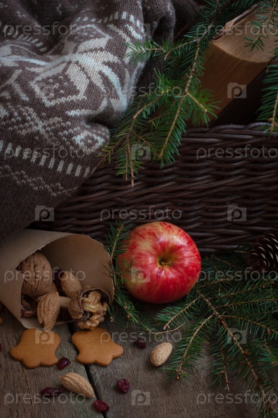 Яблоко на ветке с рождественской елкой и старой книгой